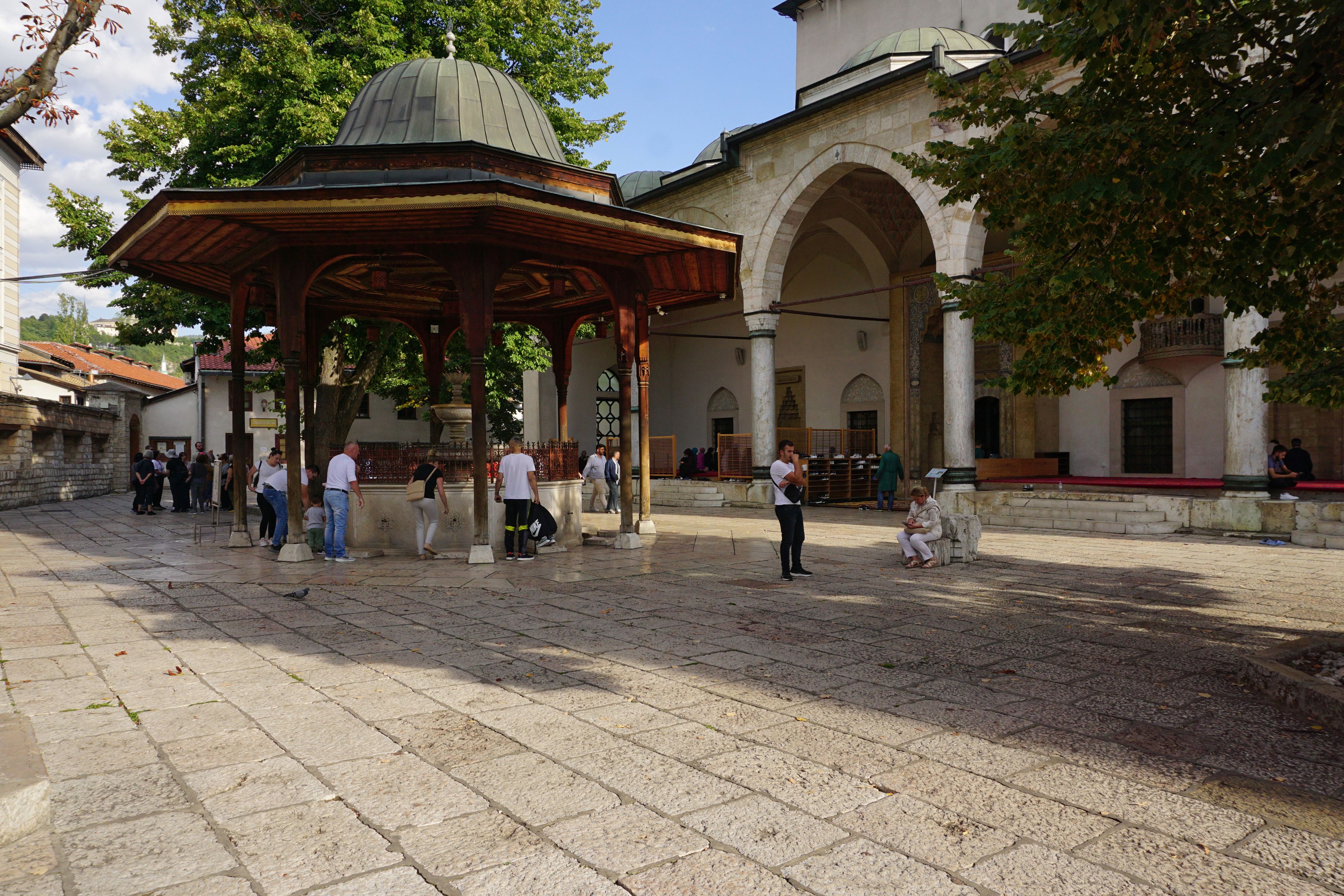Die Gazi Husrev-Bey Moschee ist die größte Moschee Bosniens und wurde um 1530 errichtet. Vor allem der schattige Hof mit seinem Šadrvan (Moscheebrunnen) ist wunderschön. Yven spielt mit Begeisterung an den Wasserauslässen und wir beobachten inzwischen die vielen Gläubigen, die hierher zum Gebet komme
