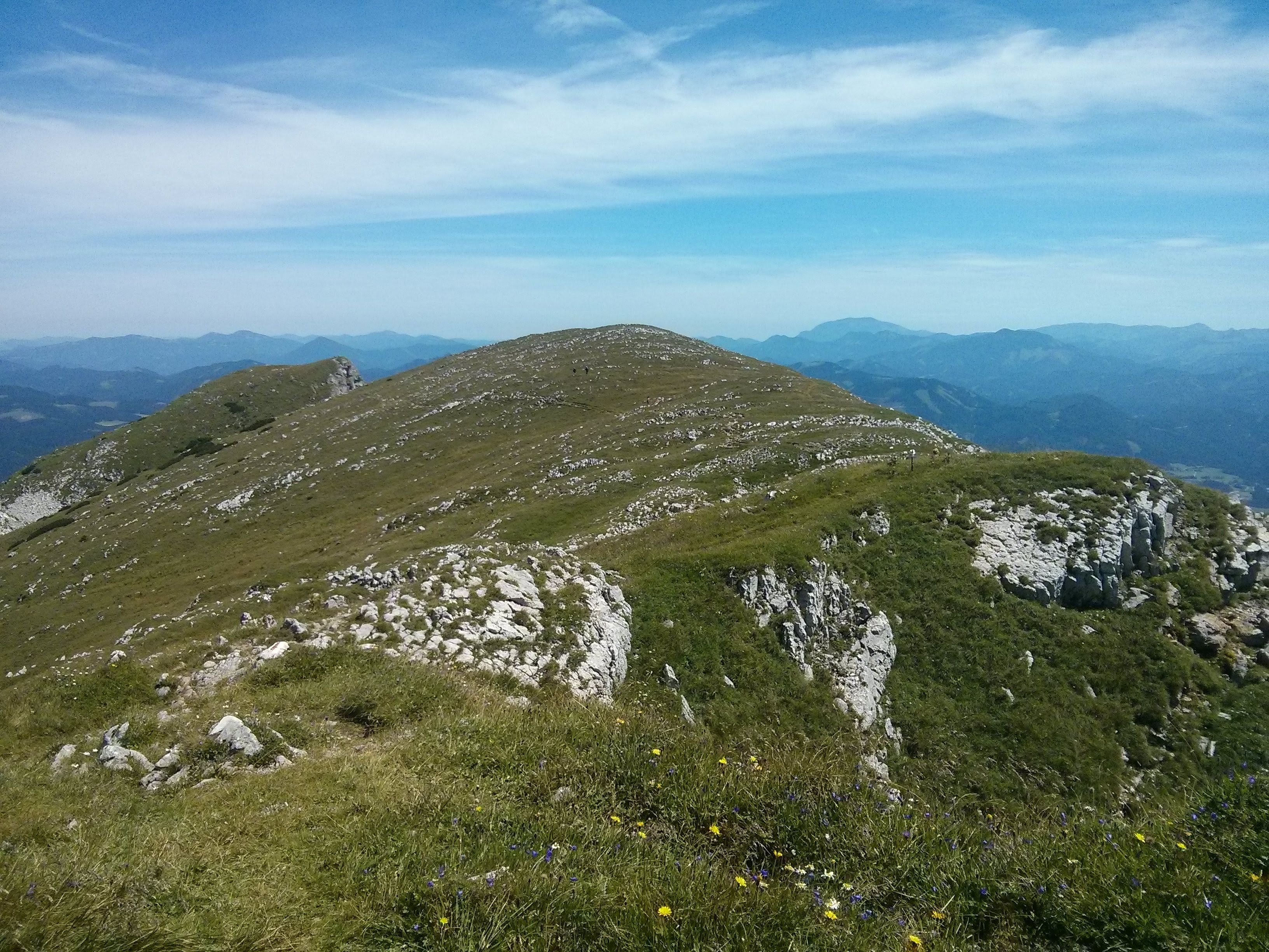 Von der Bergstation beim Ötscherschutzhaus geht es dann ca. 100 Höhenmeter auf einem gut ausgebauten, breiten Fußweg bergauf. Dann wird der Weg allmählich zu einem Steig und nach weiteren 100 Höhenmetern erreichen wir den Westgrat des Großen Ötschers. Das hört sich etwas spektakulärer an als es ist, der Grat ist breit, mäßig steil, teilweise bewachsen und sehr angenehm zu begehen. In seinem Verlauf nimmt die Vegetation dann immer mehr ab, bis es nur mehr wiesenhohe Gewächse gibt und der Weg wird etwas steiniger. Eine Kletterpartie - wie man sie oft in den Kalkalpen findet - ist diesmal nicht dabei. Die noch verbleibenden 300 Höhenmeter bis zum Gipfel sind rasch bewerkstelligt und kurzweilig, da man fast die ganze Zeit über den tollen Blick auf die Berglandschaft der Ybbstaler Alpen beidseitig des Grats genießen kann. Es bietet sich eine fast durchgehendes 360°-Panorama.