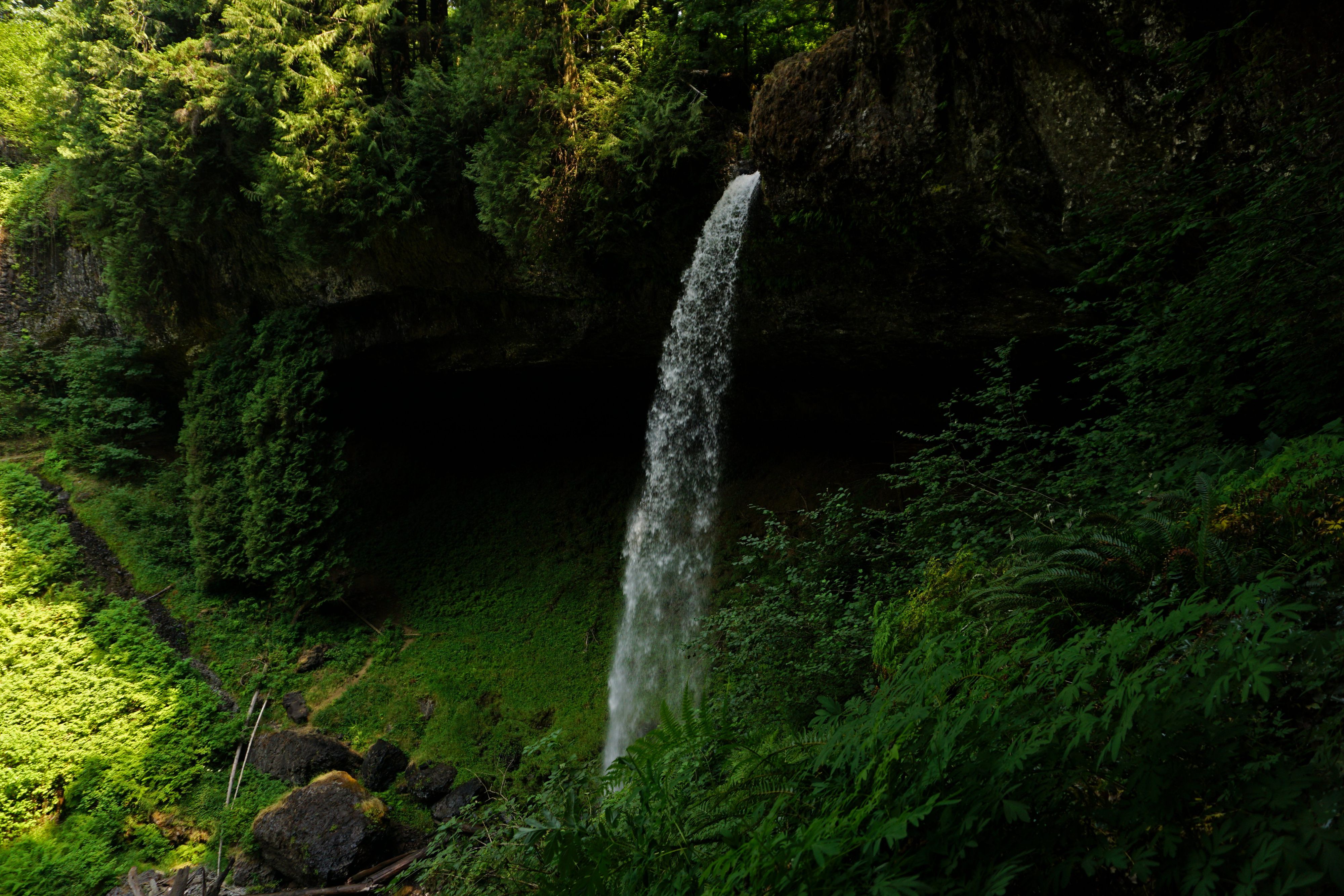 Wir laufen den Trail gegen den Uhrzeigersinn und kommen somit als erstes an den North Falls vorbei. Der Wanderweg führt hinter dem Wasserschleier vorbei. Durch die höhere Luftfeuchtigkeit, die das Nass mit sich bringt, sprießen rundherum Moose und Farn in sattestem Grün.