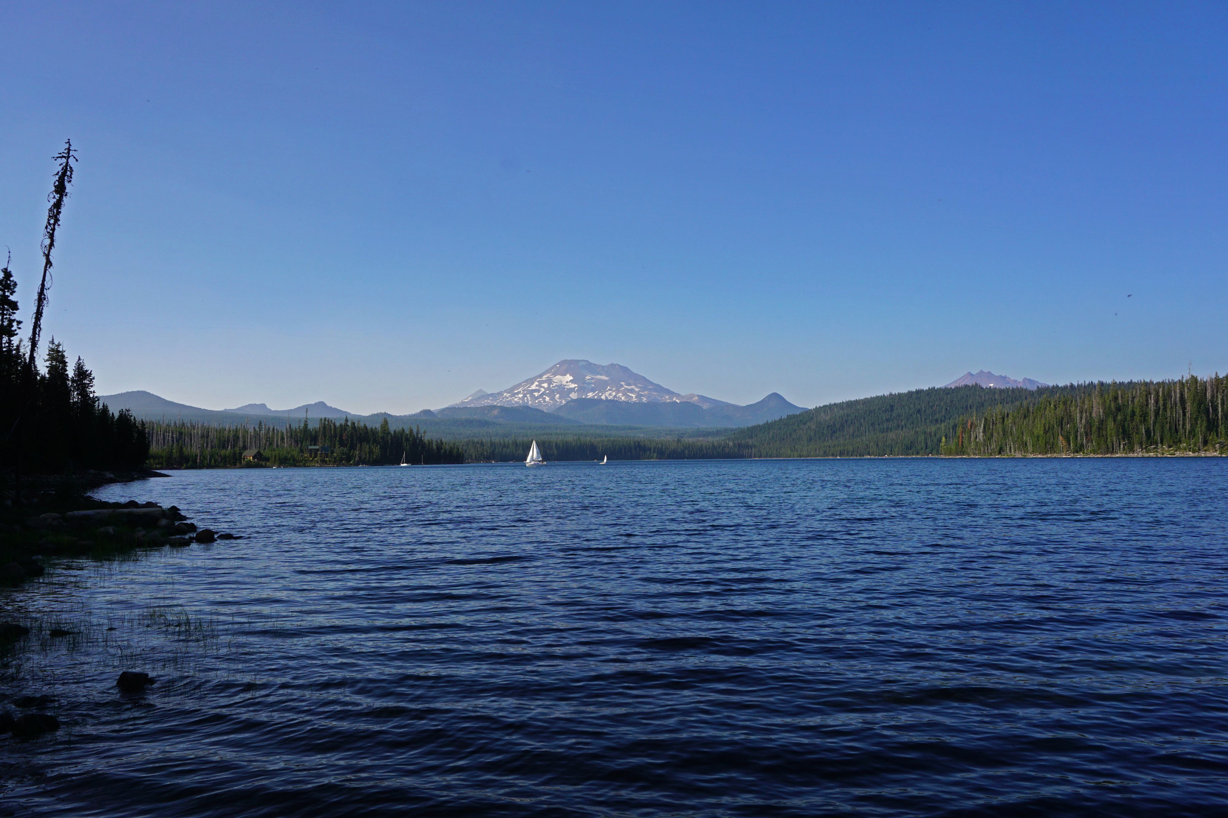Beim Point Campground am Elk Lake machen wir eine längere Pause. Von den direkt am Wasser gelegenen Zeltplätzen hat man einen unbeschreiblichen Ausblick auf den See und die dahinter liegenden Three Sisters. Wir sind verzaubert von der Abendstimmung und dem Ort generell und wissen, dass wir hier definitiv noch einmal zum Campen herkommen werden.