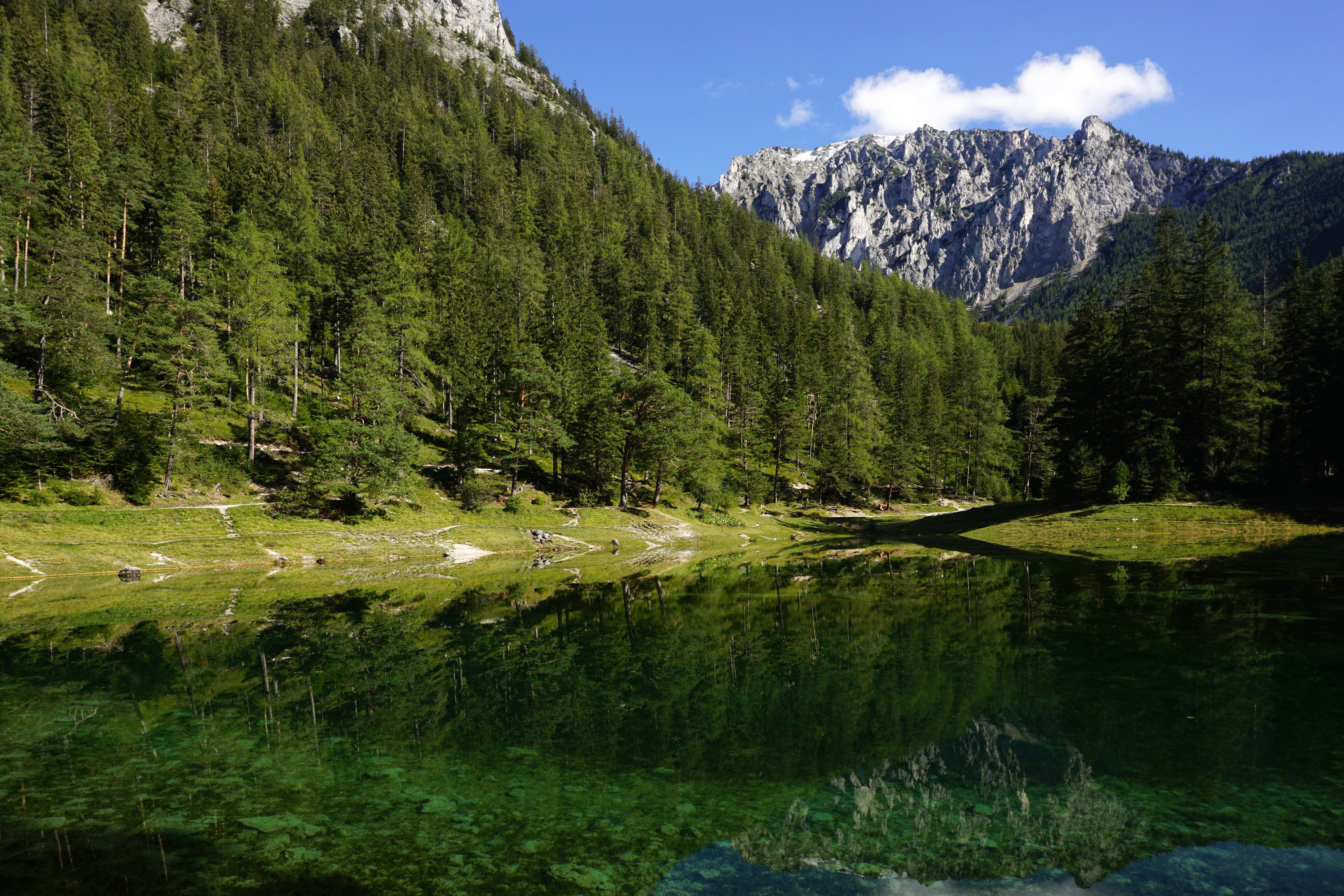 Nach einem kurzen Stück Wald kommen wir dann zum “Grünen See”. Der Karstsee wird von geschmolzenem Schnee gespeist und besitzt daher sehr klares Wasser, das vor allem die blau-grünen Anteile des Lichts reflektiert und so zu seiner unverwechselbaren Farbe führt.