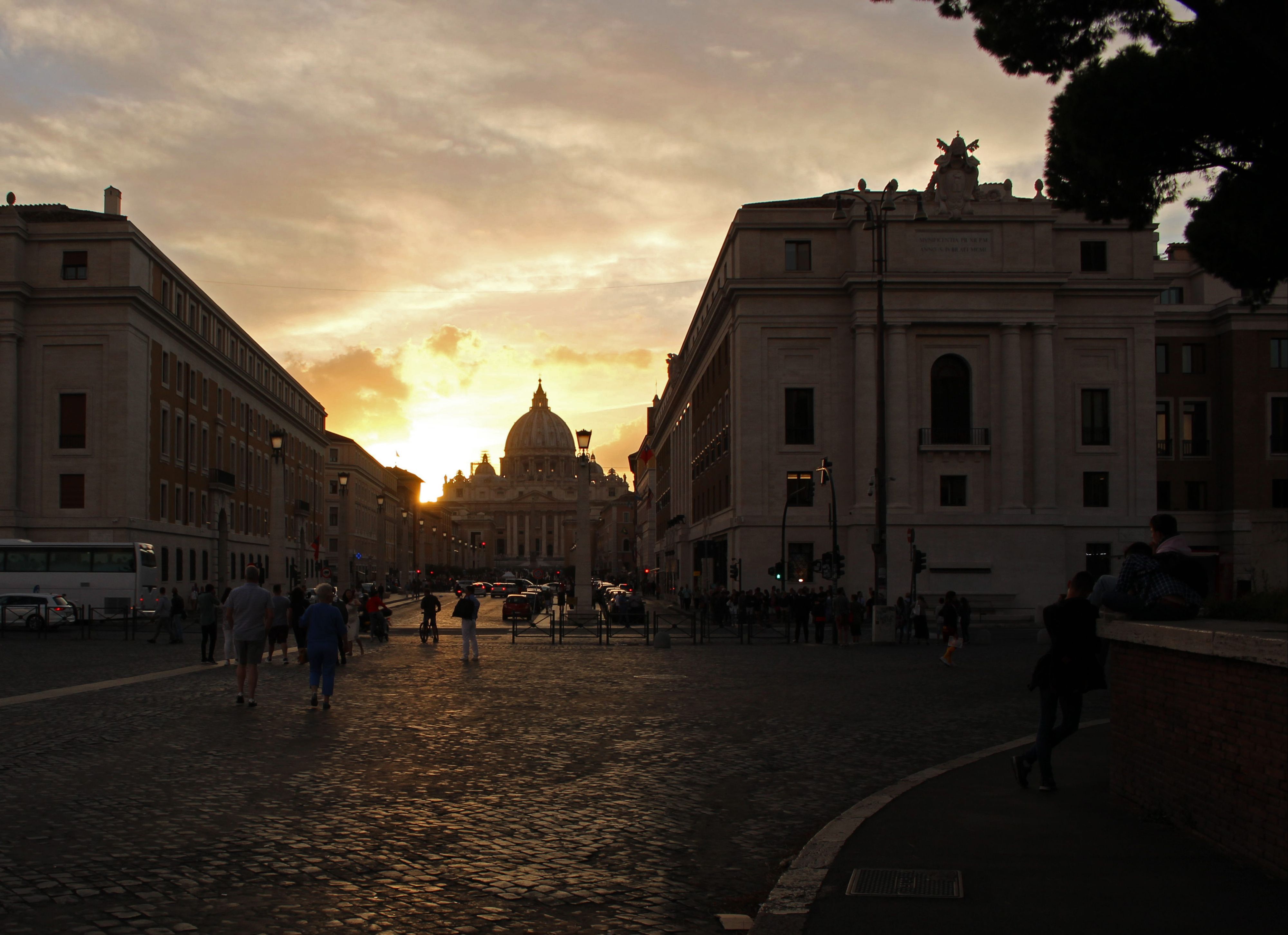 Zum Pflichtprogramm eines jeden Rom-Besuchs gehört natürlich der Vatikan. Die Prachtstraße Via della Conziliazione führt von der Engelsburg zentrisch auf den Petersplatz zu. Der ovale Platz mit den umlaufenden Kollonaden wurde von Bernini im 17. Jahrhundert erbaut. Die Mitte markiert ein unbeschrifteter ägyptischer Obelisk. Obwohl der Platz eigentlich nicht so groß ist wie wir ihn uns vorgestellt haben, bildet er einen würdigen Rahmen für den Petersdom an seinem westlichen Ende.