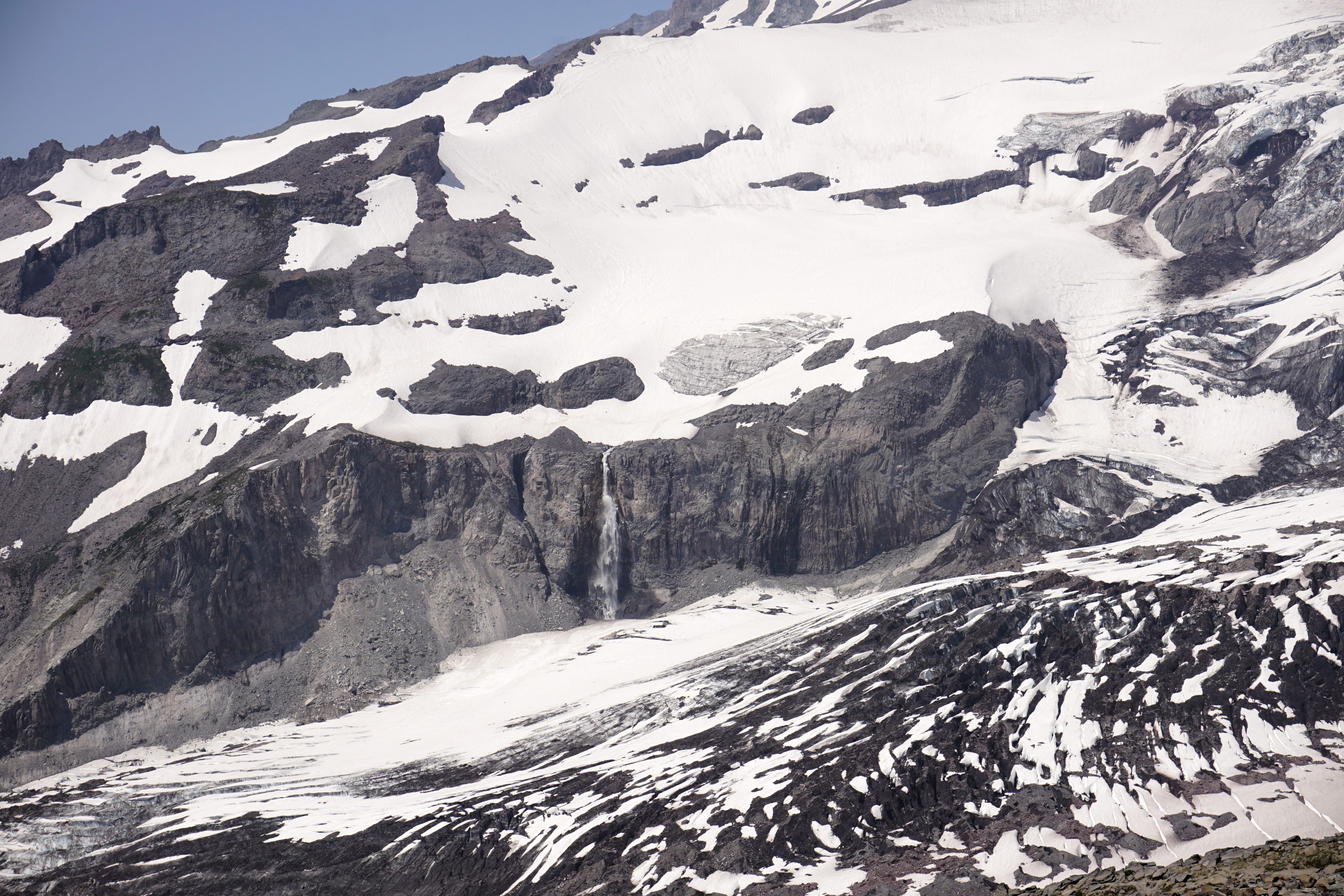 Wir bleiben lange auf der Anhöhe und schauen fasziniert auf die Gletschermassen, die bis auf unsere Höhe "herabfließen". Dazwischen stürzen spektakulär Fälle aus Schmelzwasser herunter. Was für eine unglaublich tolle Landschaft!